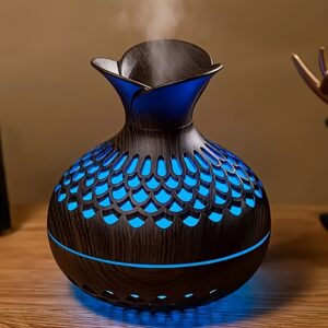Smart Home, Smarte BeleuchtungEleganter Tiefholzmaserung Mini-Luftbefeuchter mit LED-Nachtlicht – Leise, tragbar über USB betriebener Kühlmist für Schlafzimmer, Büros & Arbeitsräume, Mehrfarben-Doppelnebelmodi, blaue LED-Basis, geometrisches Design, Kühlmist-Luftbefeuchter